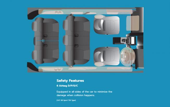 Toyota All New Raize memiliki kelengkapan fitur keselamatan seperti 6 airbag, TSS + BSM RCTA dan Pedal Misoperation Control. Semua itu ada dalam varian 1.0 Turbo GR Sport CVT TSS.